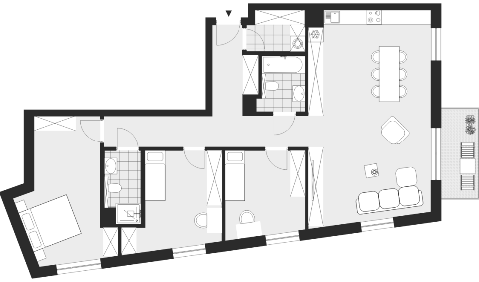 Oferujemy 4-pokojowe mieszkanie składające się z pokoju dziennego z aneksem kuchennym, trzech sypialni, garderoby, dwóch łazienek i balkonu. (...)