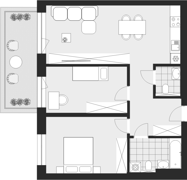 4-pokojowy apartament premium składający się z pokoju dziennego z aneksem kuchennym, 3 sypialni, 2 łazienek, garderoby i 2 balkonów.