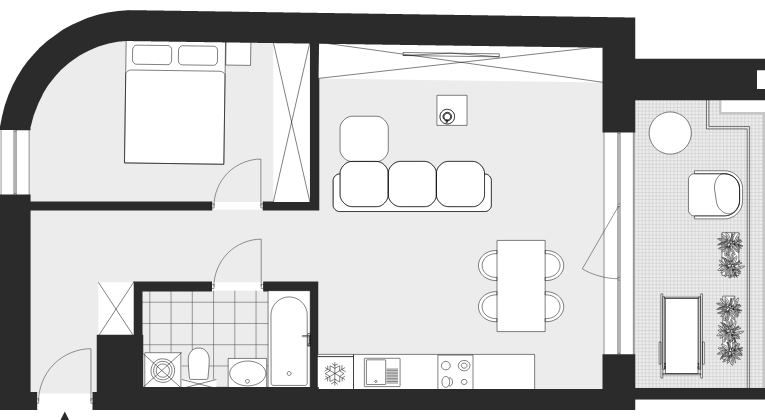 4-pokojowy apartament premium składający się z pokoju dziennego z aneksem kuchennym, 3 sypialni, łazienki, WC, 2 balkonów i tarasu.