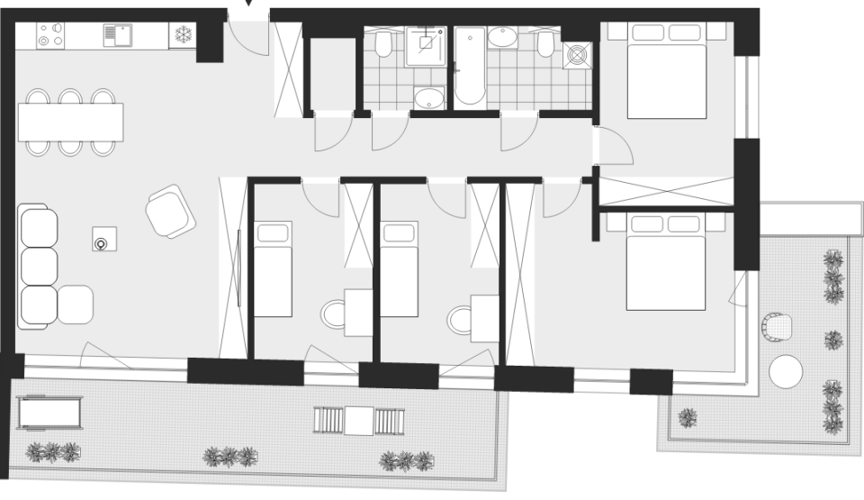 4-pokojowy apartament premium składający się z pokoju dziennego z aneksem kuchennym, 3 sypialni, 2 łazienek, garderoby i 2 balkonów.