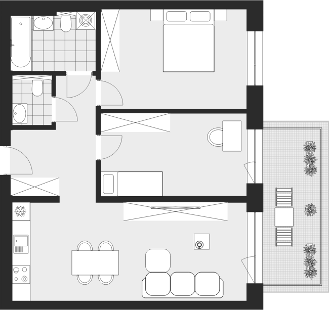 4-pokojowy apartament premium składający się z pokoju dziennego z aneksem kuchennym, 3 sypialni, łazienki, WC, 2 balkonów i tarasu.