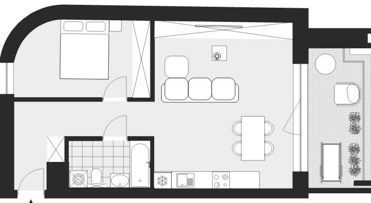 4-pokojowy apartament premium składający się z pokoju dziennego z aneksem kuchennym, 3 sypialni, łazienki, WC, 2 balkonów i tarasu.