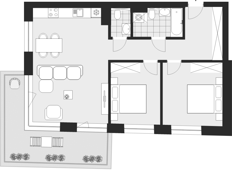 4-pokojowy apartament premium składający się z pokoju dziennego z aneksem kuchennym, 3 sypialni, łazienki, WC, 2 balkonów i tarasu.
