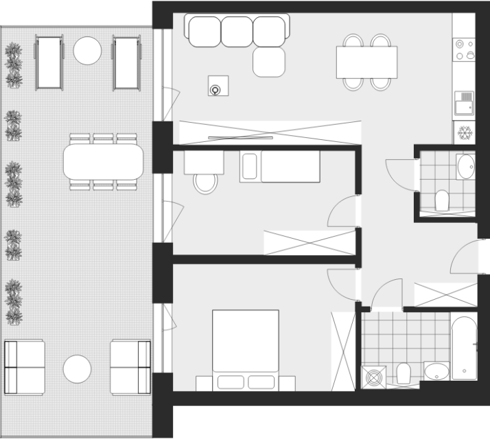 4-pokojowy apartament premium składający się z pokoju dziennego z aneksem kuchennym, 3 sypialni, łazienki, WC, 2 balkonów i tarasu.
