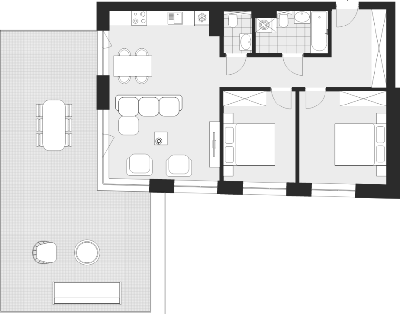 4-pokojowy apartament premium składający się z pokoju dziennego z aneksem kuchennym, 3 sypialni, łazienki, WC, 2 balkonów i tarasu.